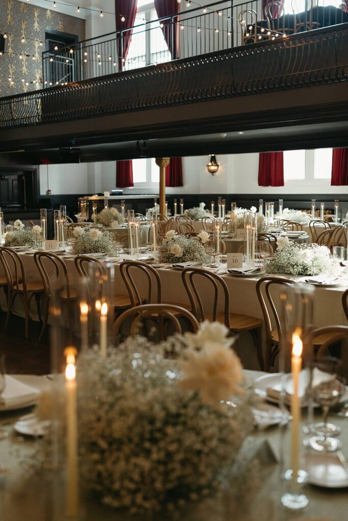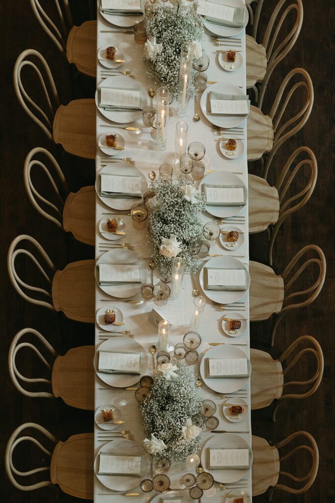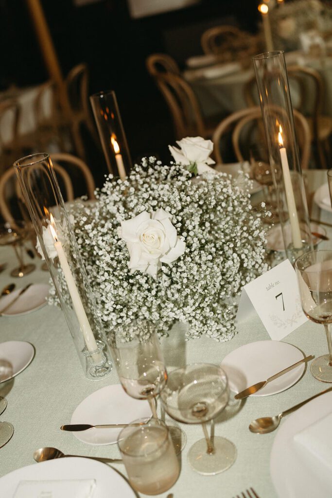 The design direction was built around Tamara’s favourite flowers – white roses and baby’s breath – paired with a refined palette of sage and ivory. We incorporated lush clouds of baby’s breath on long harvest tables, soft candlelight in tall glass holders and minimal stationery for a look that was fresh, modern and romantic.