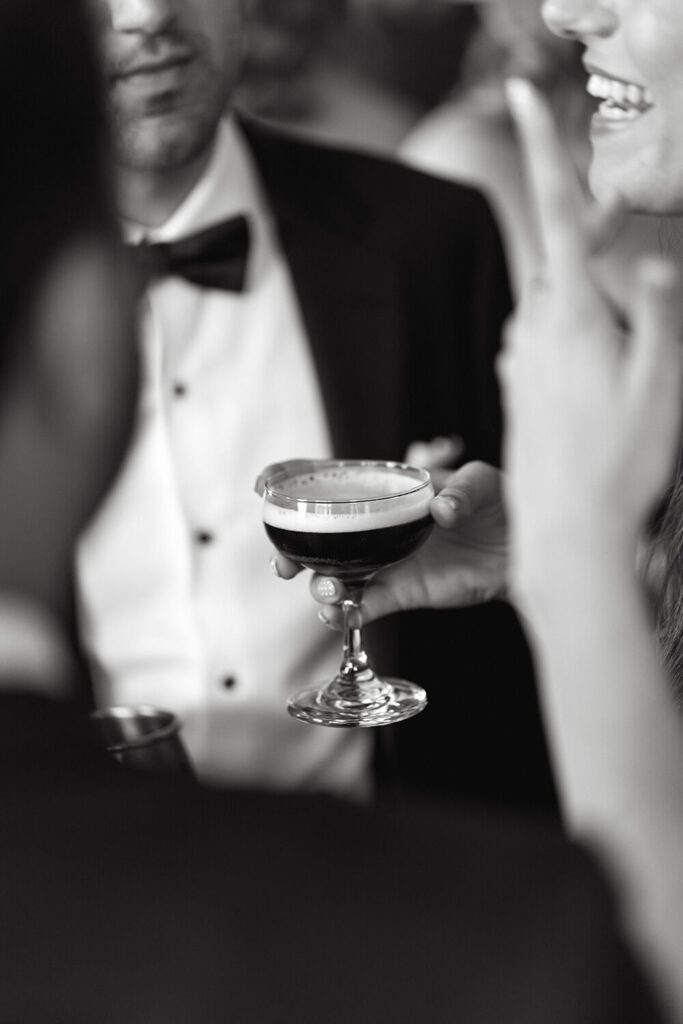 Following the ceremony, guests were welcomed to a romantic candlelit reception at The Great Hall, one of Toronto’s most iconic venues in the heart of Queen West. With its historic architecture, red velvet draping and intimate mezzanine level, it was the perfect setting for a modern-yet-timeless wedding design. During cocktail hour, a Ukrainian band played traditional music in honour of Tamara’s heritage, creating a joyful and celebratory atmosphere as guests mingled. To add a personal touch, the signature drink – an espresso martini – was a nod to the couple’s favourite cocktail and a perfect pairing for the lively energy of the evening.