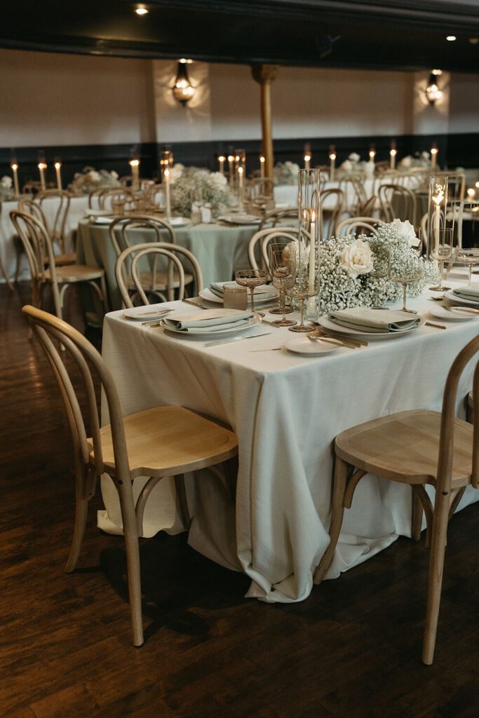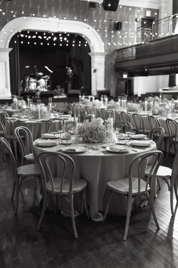 Each table was styled with intention: harvest tables were given elevated flatware and florals for maximum visual impact, while round tables were kept simple to balance both the budget and aesthetic. The result was a room that felt layered and harmonious from every angle.