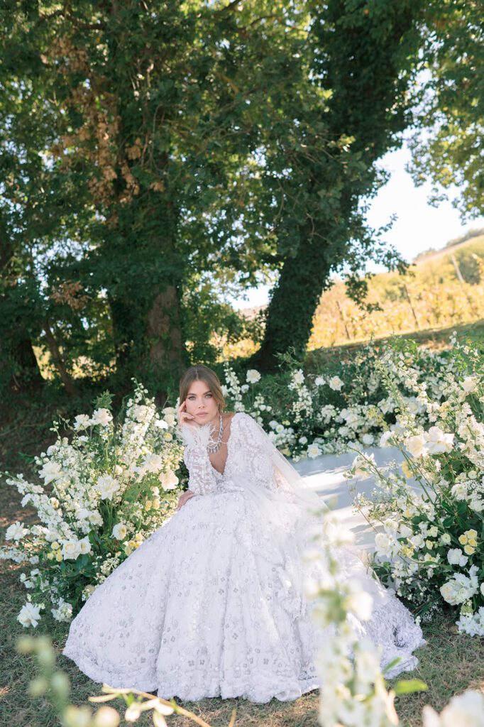 Our editorial took place at Tenuta Santi Giacomo e Filippo, a breathtaking estate in Urbino, Italy. The property blends historic architecture with expansive countryside views, creating the perfect canvas for destination wedding design.