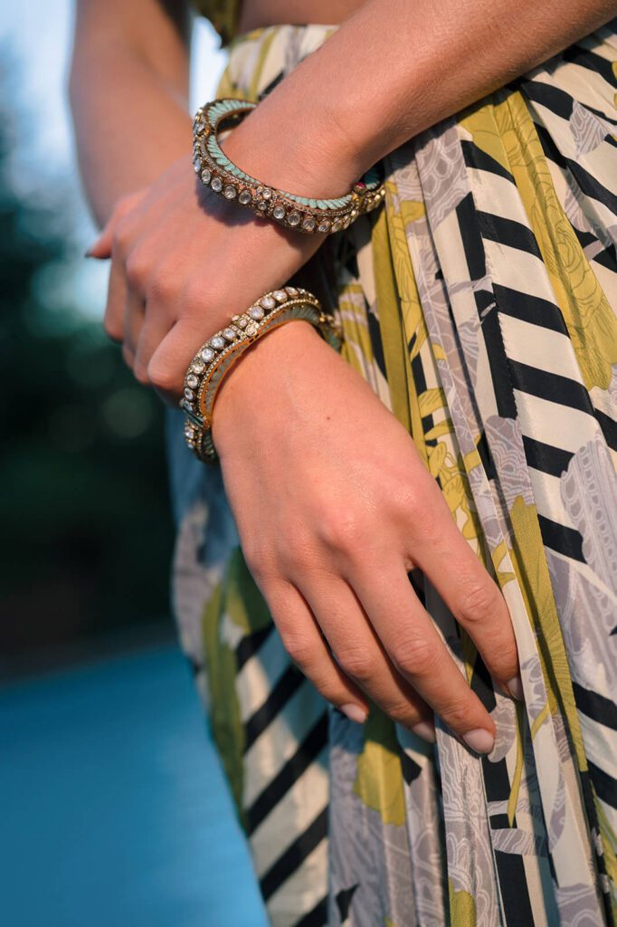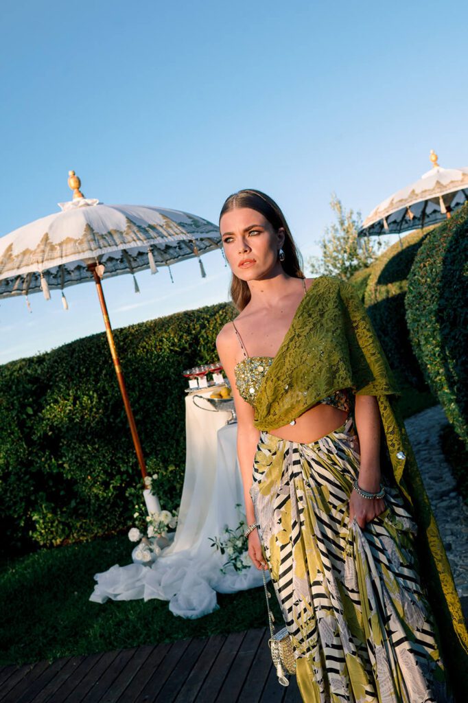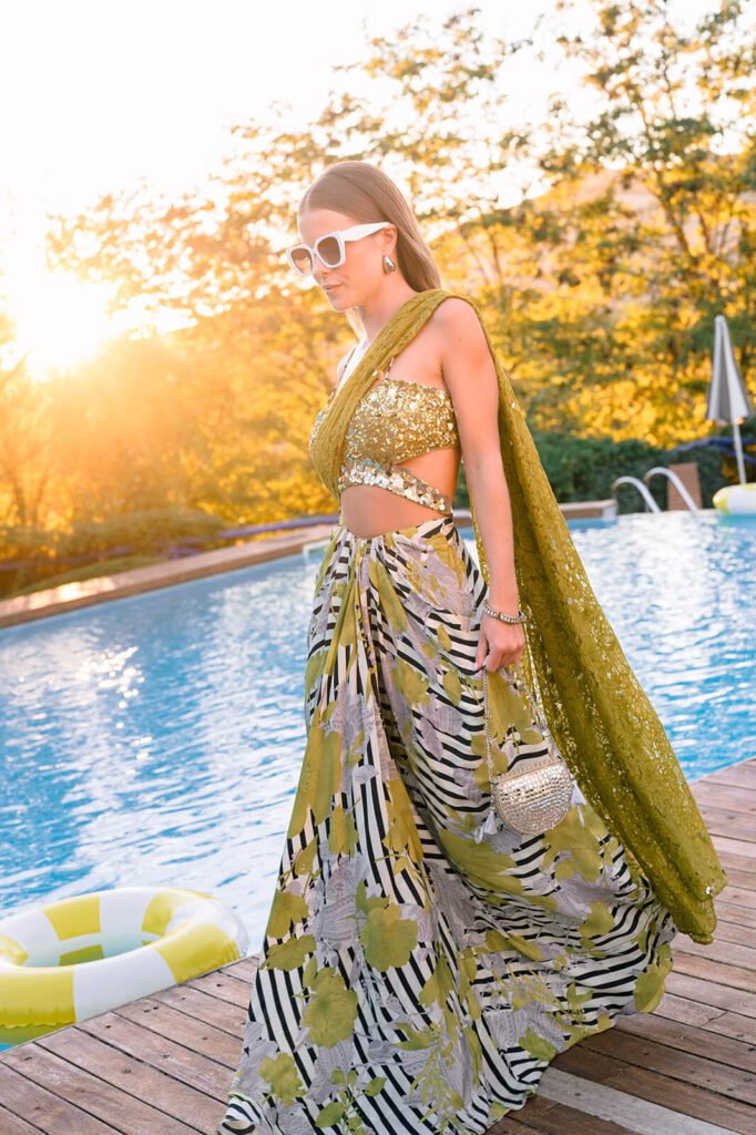A draped saree with a more playful, celebratory energy. Perfect for a wedding weekend setting, especially for rooftop cocktails, aperitivo hour, or an evening reception with music and dancing.